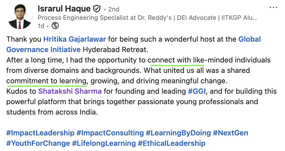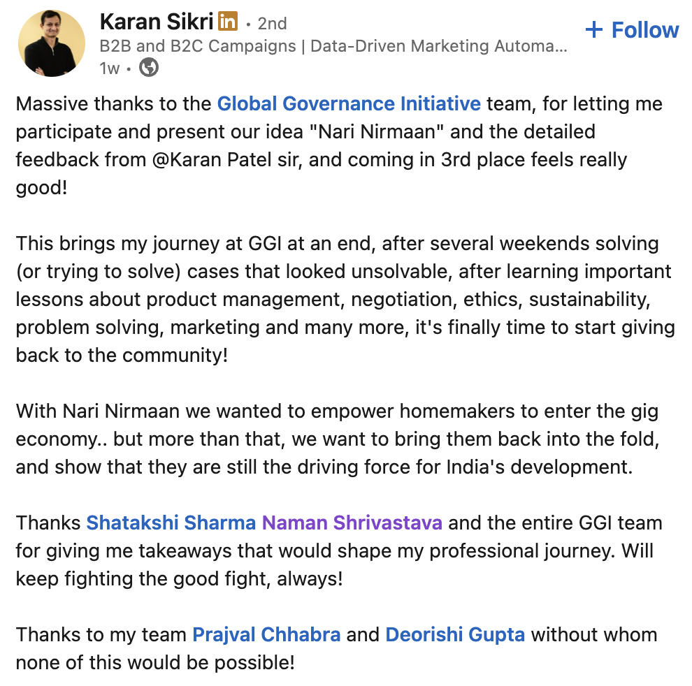 Also, wanted to inform you that I would be joining BCG the coming month and this probably would not have been possible without GGI by my side. Thanks for building this community :) ”