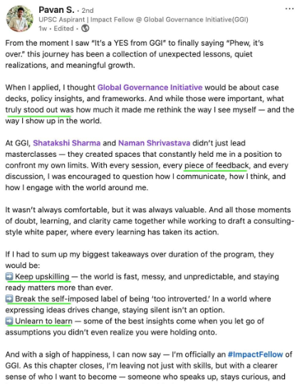 All this eventually culminated into bagging offers from DCPCR, GDI and Samagra. The GGI masterclass was the turning point for me where I took the decision to pivot from UPSC to governance consulting. I'm so glad I took the plunge!”