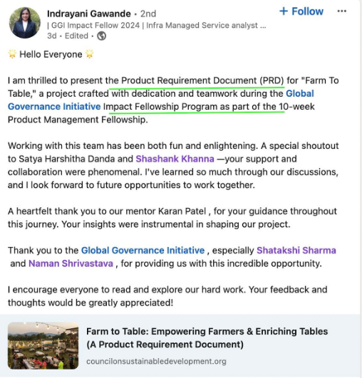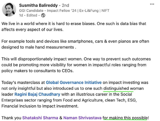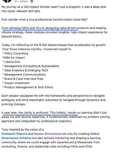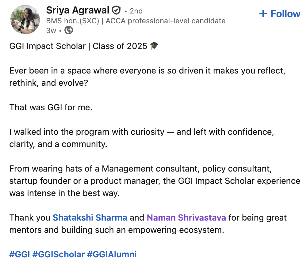 This became my biggest motivation to join the GGI Impact Fellowship. There, my journey started. I was able to learn so much about #impactconsulting and management consulting, and I met so many people who helped me build my career in this space.