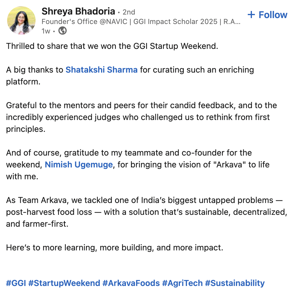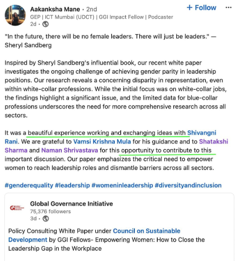 I would like to express my gratitude to the diverse GGI network and supportive mentors like Naman Shrivastava and Shatakshi Sharma for guiding me throughout.”