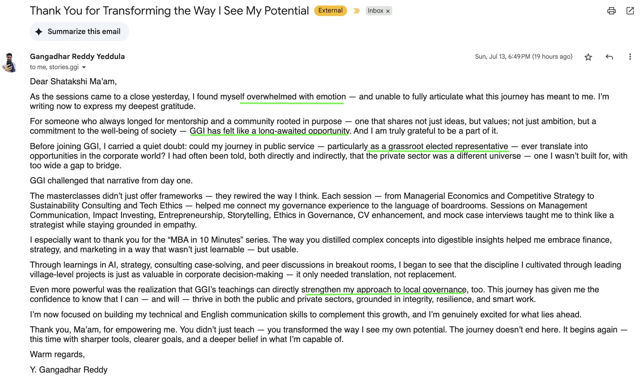 At this stage, I came across GGI and I could relate to the founder's journey because I was going through the exact same journey. That was my tipping point which led me to apply for GGI Fellowship.