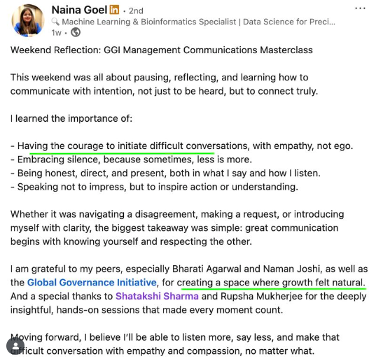 Soon after, I joined #GGI and attended my first and one of the most interesting Masterclass was- Management Communications. The kind of people I got to know in the first class itself made me believe that I am at the right place, and I thoroughly enjoyed the class.